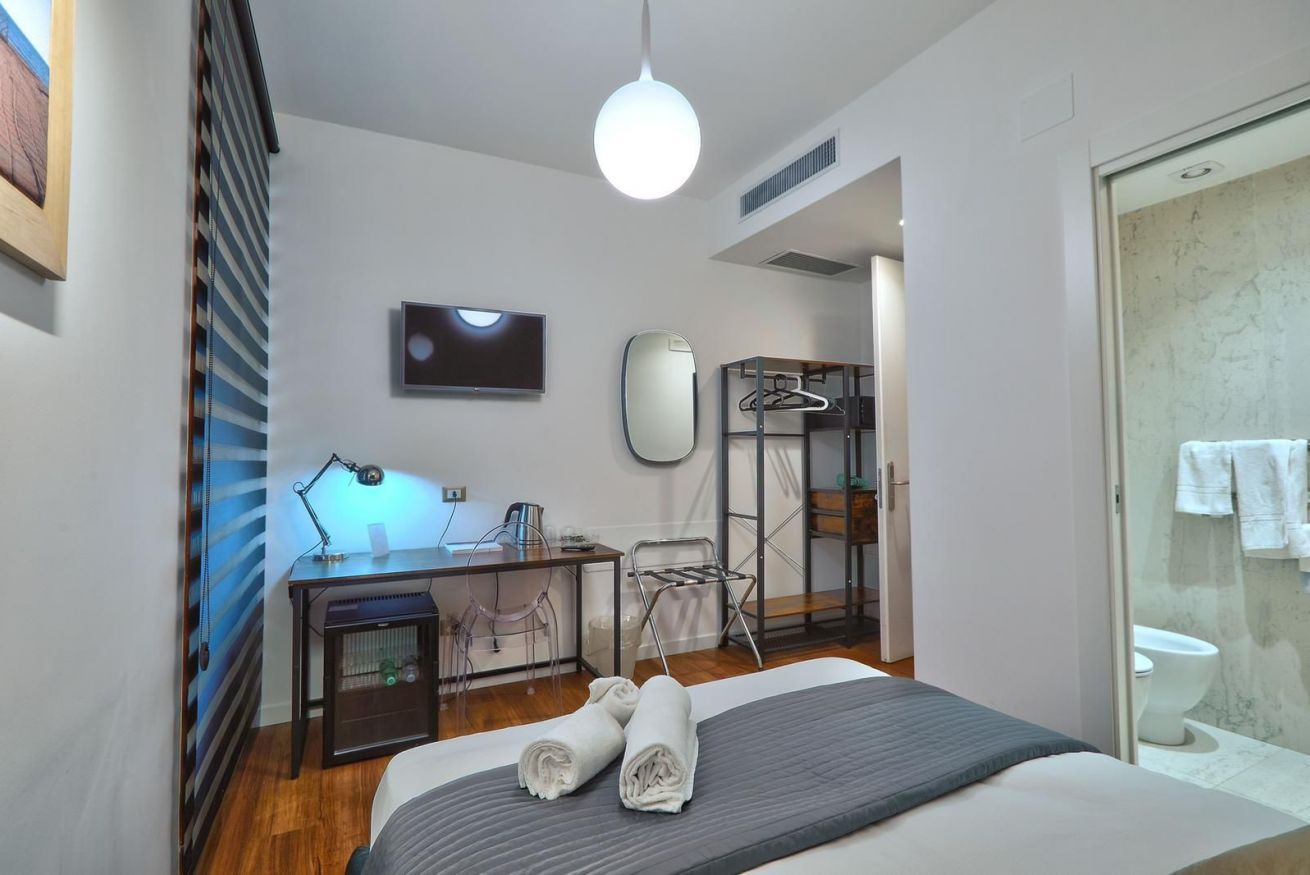 Un'ambiente elegante e funzionale, con letto matrimoniale queen size e balcone con infisso insonorizzato e terrazzino sulla via principale. In camera scrivania, sedia, armadio, cassaforte, minibar, bagno privato con ampia doccia e kit di cortesia.